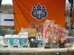 参加賞の土地家屋調査士会名入りのボールペン、クリヤーファイル、そして土地家屋調査士の業務宣伝広告、土地家屋調査士会のオレンジの横断幕、ブルーの突撃旗。