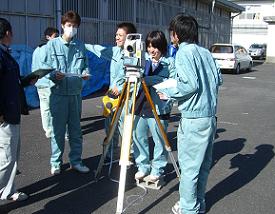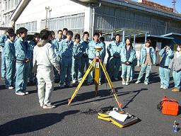 次にアスファルト舗装の広場に移動し、最新の測量事情ということでGPSでのスタティック法とRTK法の説明。講師は山口理事と高澤理事。生徒達は興味深く話を聞いている。高校生にとってGPSとは携帯電話やカーナビゲーションで、我々以上に身近な存在なのかもしれない。