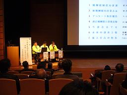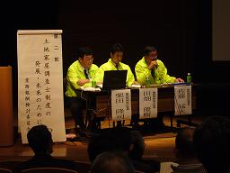 研修といえる内容は以上でしたが、これに引き続いて、平成21および22年度の新入会員30名全員が壇上に上がり、各班5名ずつの6班に分かれて、それぞれ新入会員としての抱負を決意表明や宣誓によって披露したほか、最後に、会場参加者が全員起立して、倫理綱領を唱和、調査士の歌の全歌詞を斉唱して、午後5時少し前に閉会しました。この新入会員による抱負の披露は、本日の研修会に先立って1泊2日で実施された新人研修会において、各班それぞれが相談して考えたものだそうです。