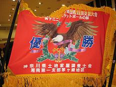 年明けの平成23年1月29日に大会があり、開会式において真新しい優勝旗を子供達、コーチ、父兄など大勢が見つめる中、茅ヶ崎スポーツ少年団に寄贈しました。子供達はもちろん関係者の方々に大変喜んでもらい、スピーチの中で「土地家屋調査士」を連呼してもらい、目的達成!